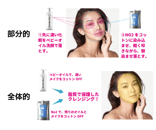 先にOILクレンジングすることで、濃い化粧もOILで馴染みコットンで拭き取り、最後にNo,2で、キレイに汚れを落とす。ミネラルファンデだけなら、No,2 のみでOK!